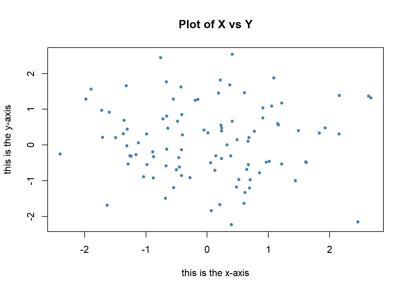 plot(x,y, pch=20, col = "steelblue",xlab="this is the x-axis",ylab="this is the y-axis",main="Plot of X vs Y") # Add labels