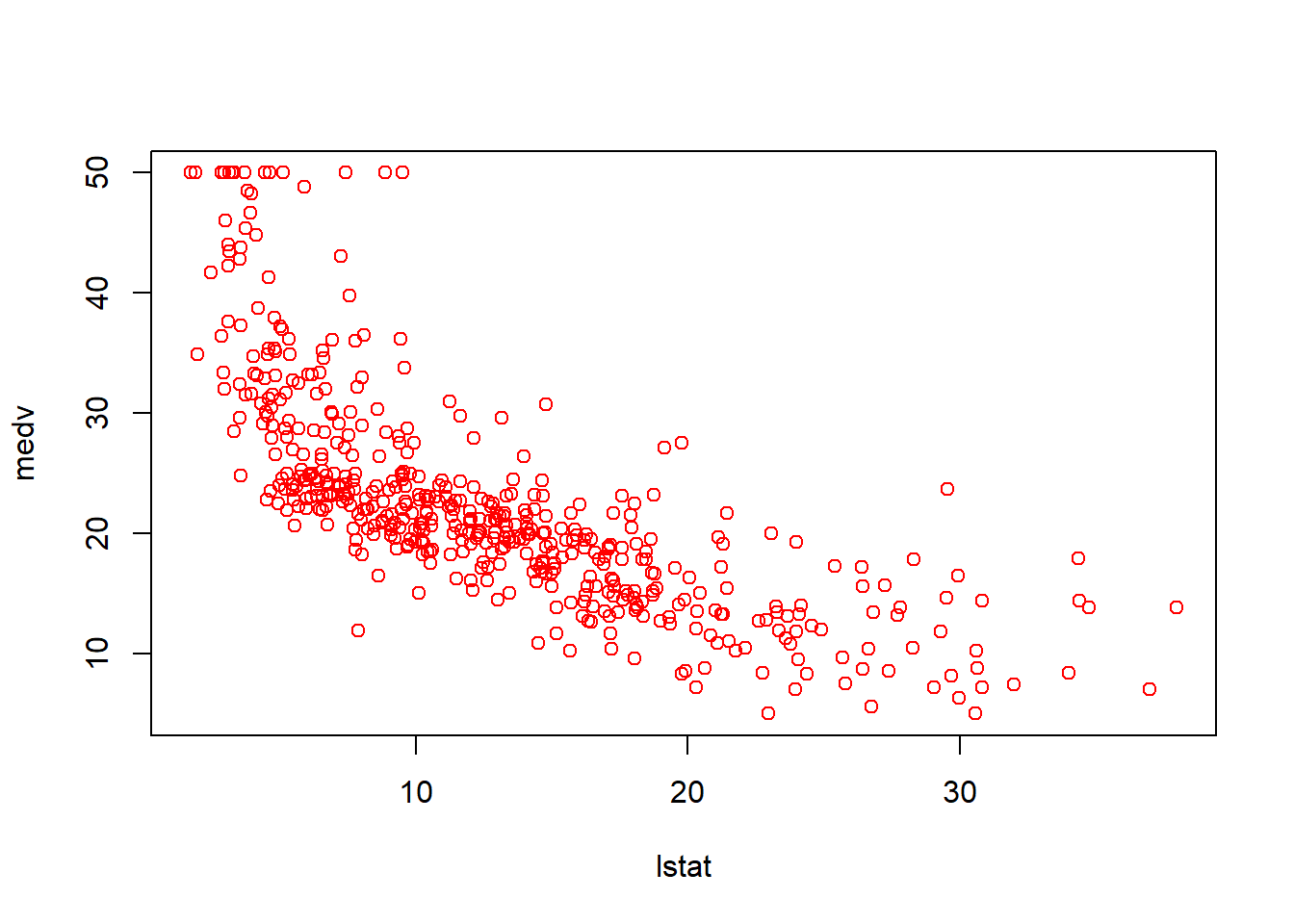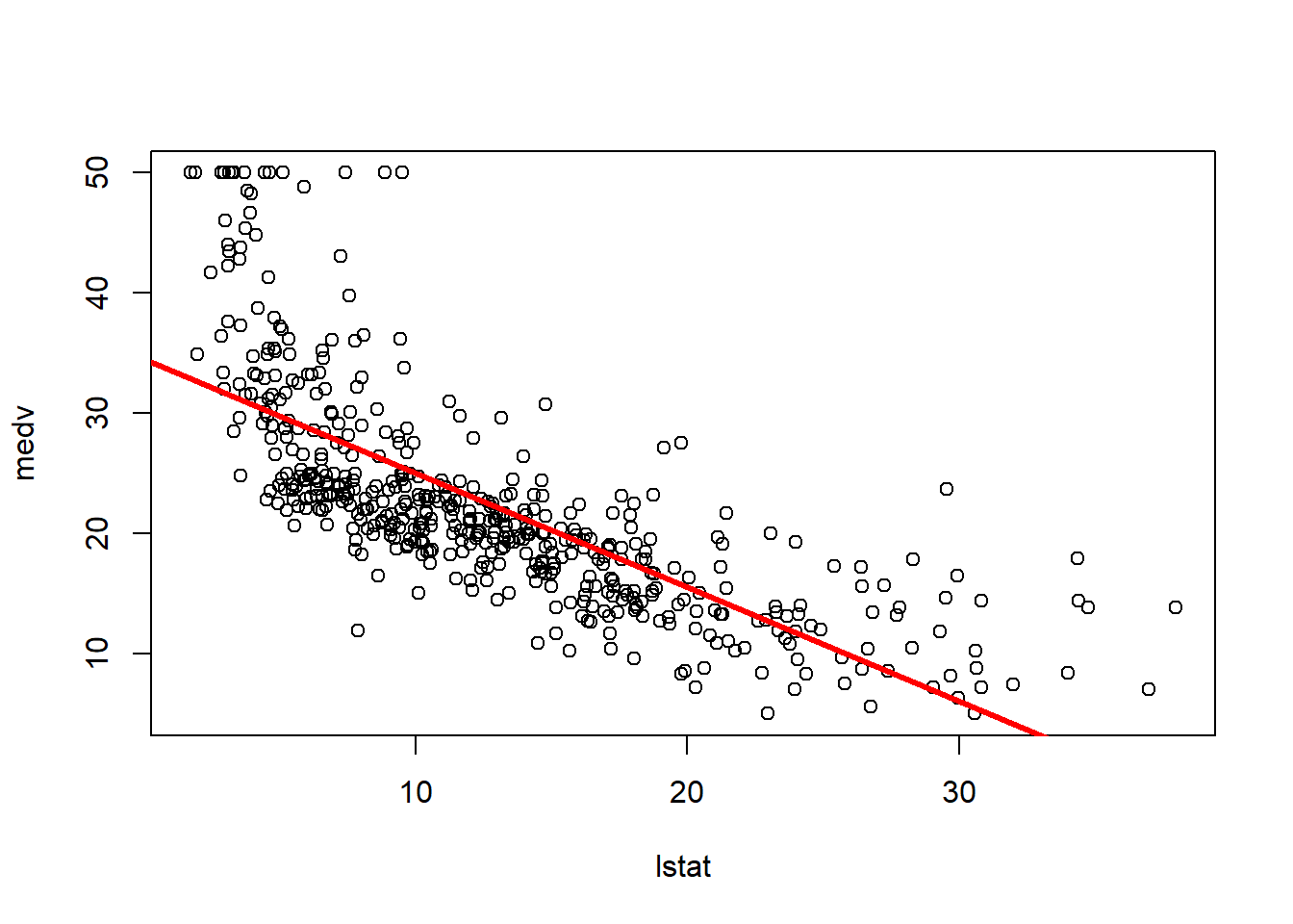 # What is the differnce between "conference" and "prediction" difference?plot(lstat,medv)abline(lm.fit)abline(lm.fit,lwd=3)abline(lm.fit,lwd=3,col="red")